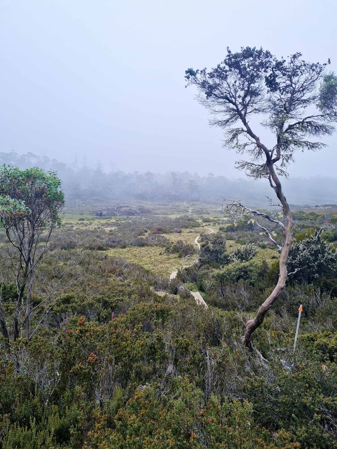 My sleep was much better than the night before, with the temperature only dropping to 8-10 degrees Celsius. I had prepared myself with extra layers and gloves plus beanie, so I was much warmer initially going to bed which allowed me to basically sleep through the night. I rose early, intending to reach the carpark by 10:30 am. Overnight, fog had rolled in through the park and resulted in a beautiful and mysterious (but eerie) low covering of the track that made for a spectacular sight and short walk back to the campsite.