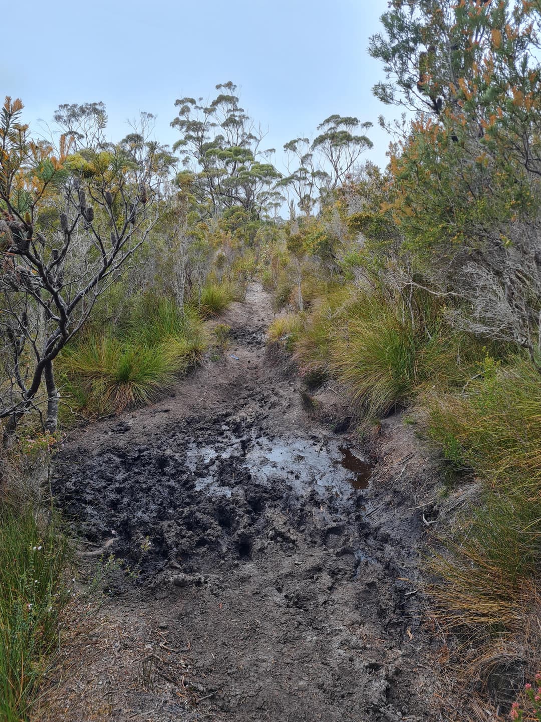 I found someone’s water bottle which reaffirmed in my mind that this indeed was the trail. But there was no trail to be seen, the scrub went down the banks towards Lake Ganymede. Six of us, stuck at the bottom of a gully, not sure where to go. After trying to find the trail by weaving through thick, mossy and slippery mud, another member of our group shouted at us, saying we’d missed the cairn for the turn off, and had gone way further down the gully.