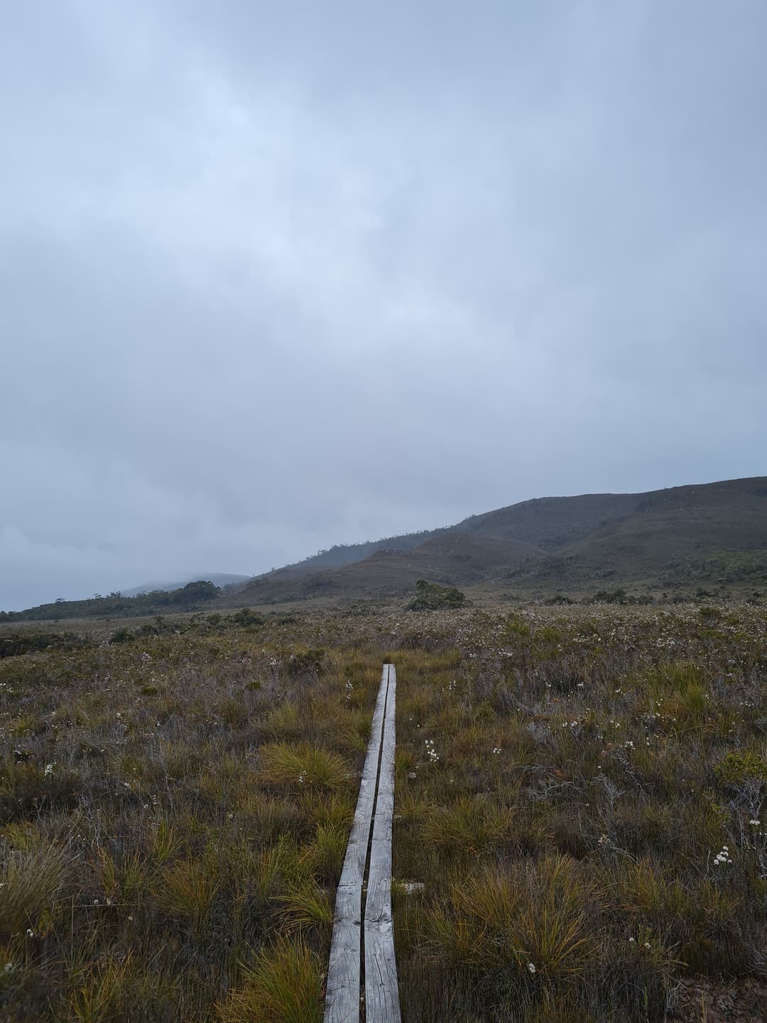 I walked through beautiful, small forests with luscious greenery and streams providing seclusion from the rain before emerging onto the button grass plains. The track following boardwalks for the first few hundred meters before being replaced by a rocky but well-trodden track. I headed quickly in the direction for Junction Creek, the first campsite of the trip.