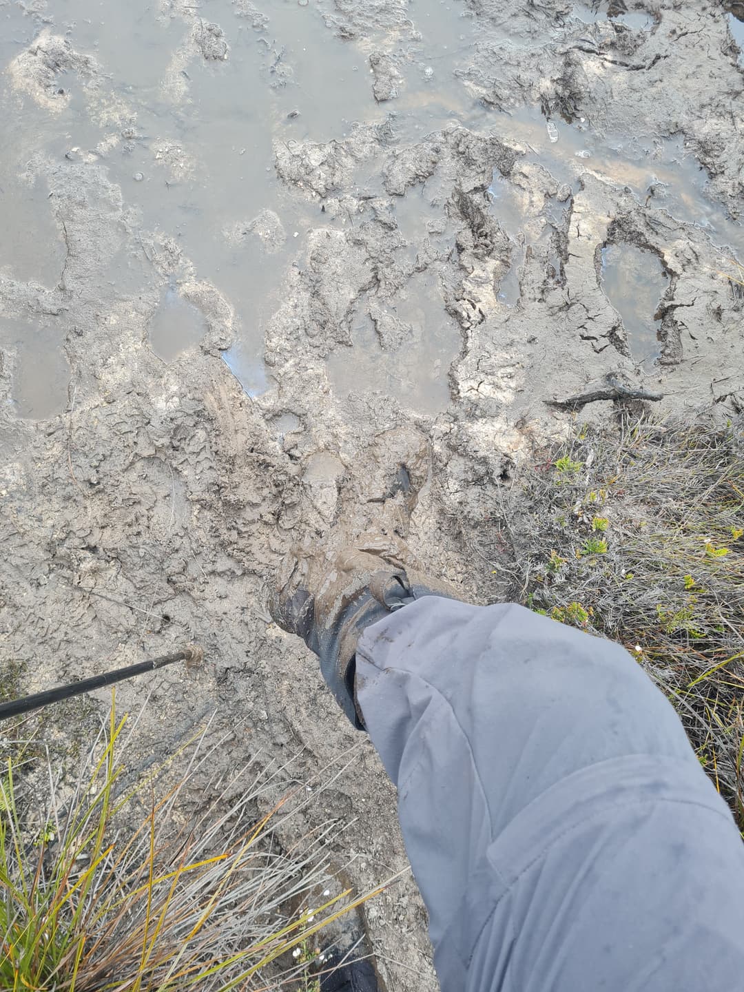 The mud wasn’t too bad, but my socks and shoes eventually soaked through with the water from the low-hanging grass and general shrubbery. There were some deep sections – easily mid-calf to knee height mud. The trekking pole provided stability and was a good depth-checker.